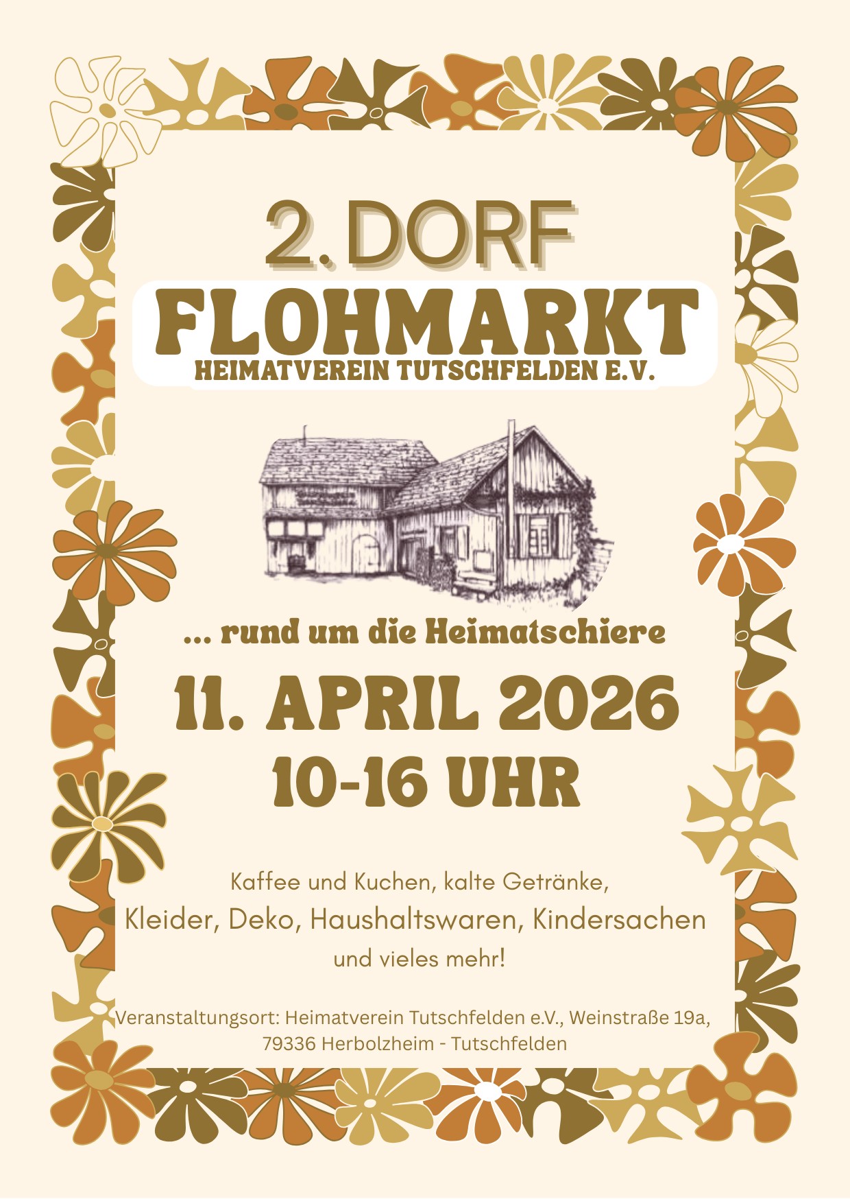Der Heimatverein Tutschfelden e.V. veranstaltet am Samstag, 11. April 2026, von 10.00 bis 16.00 Uhr den 2. Dorfflohmarkt rund um die Heimatschiere. Angeboten werden Kleidung, Haushaltswaren, Dekoartikel, Kindersachen sowie Kaffee und Kuchen und kalte Getränke.